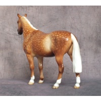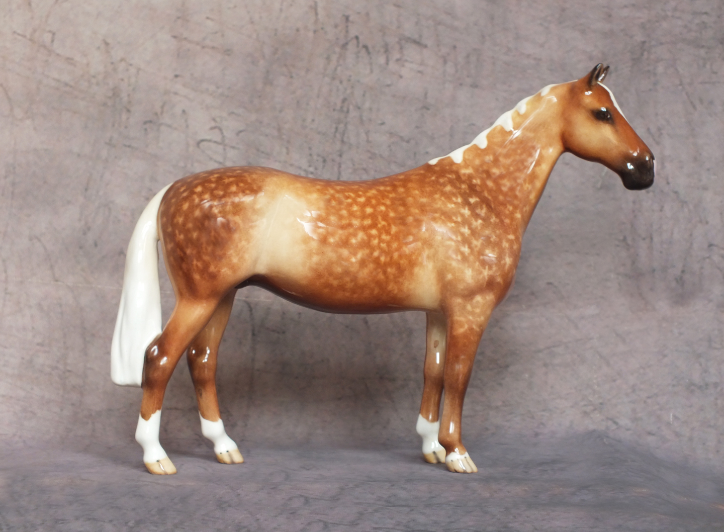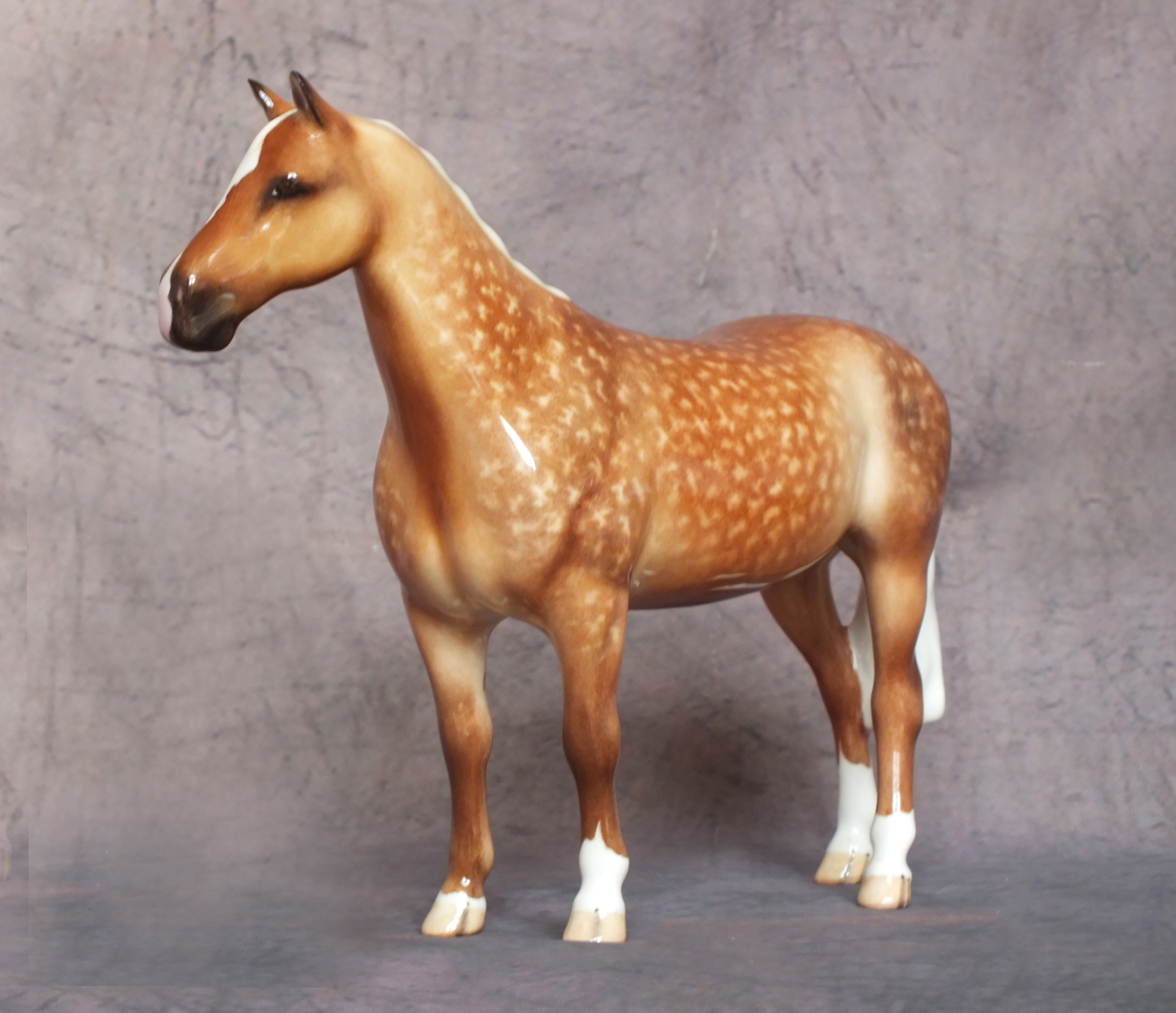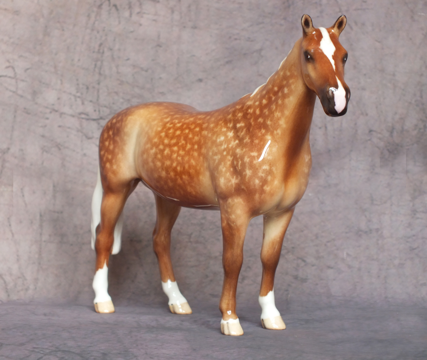 This is the Beswick 1484 Huntsman’s Horse mold which has been custom glazed by Horsing Around / The Horse Gallery. He is 6.9 inches in height. His original colour has been carefully removed and he has been custom painted to a stunning dapple palomino. His body colour is wonderfully shaded with dapples added and packed full of detail. Four white socks, a star and a large snip to his nose finish him off. He is a gloss glaze. A beautiful horse for your collection.