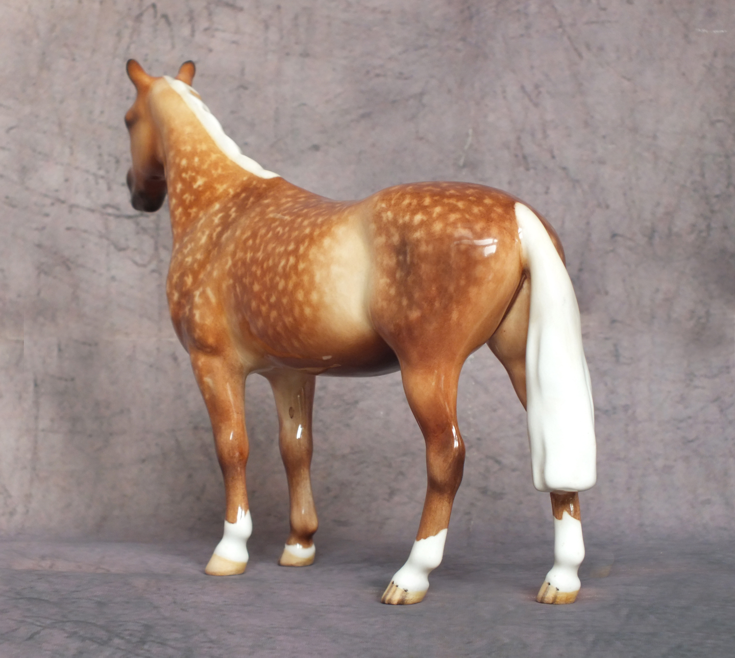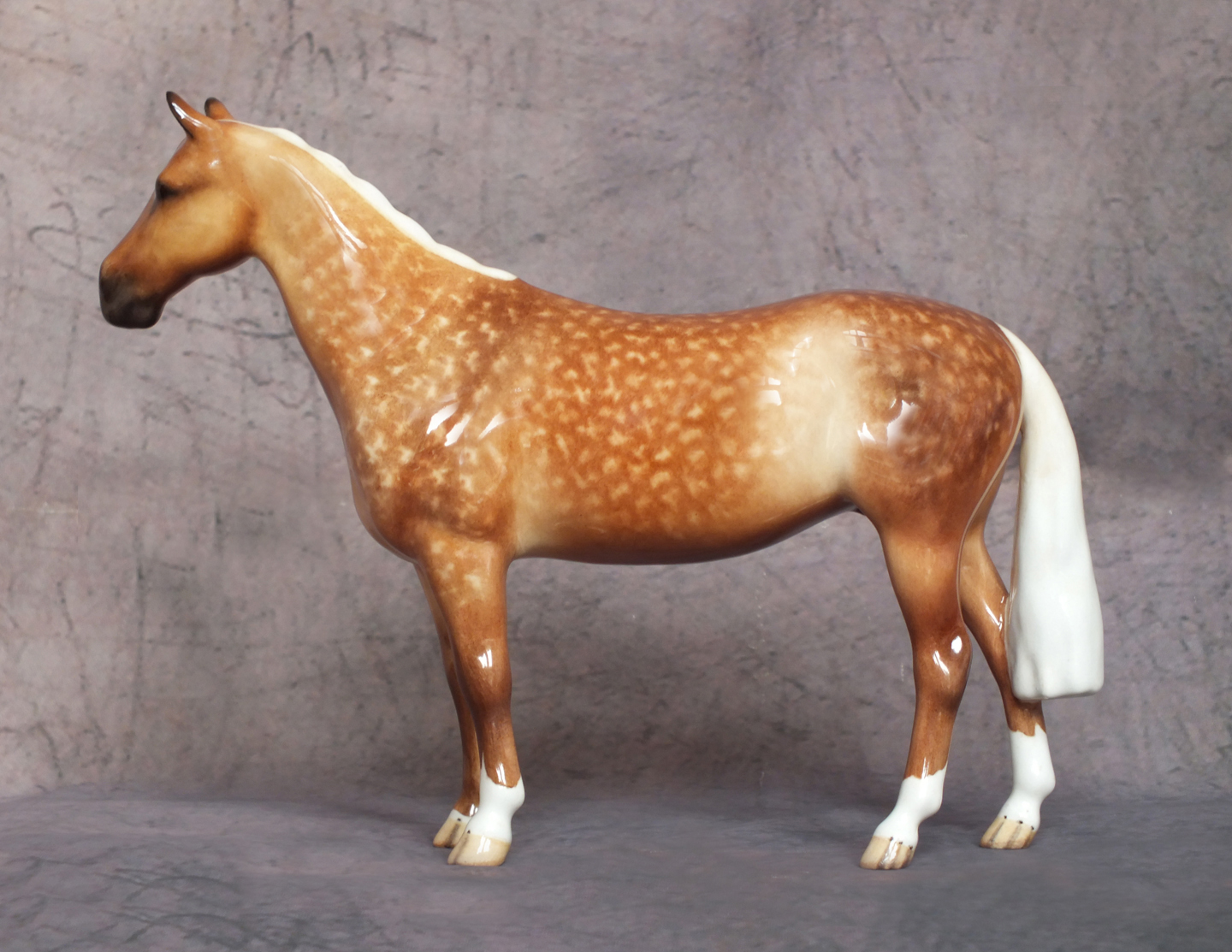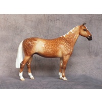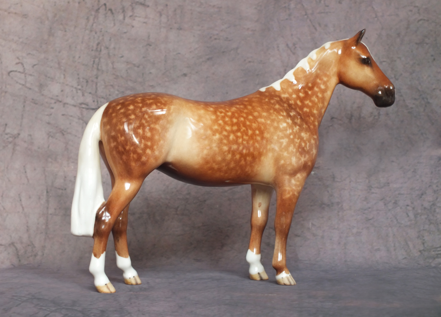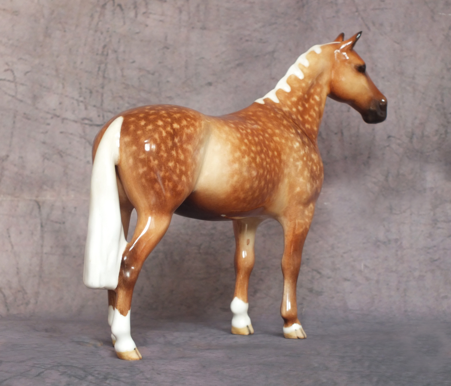This is the Beswick 1484 Huntsman’s Horse mold which has been custom glazed by Horsing Around / The Horse Gallery. He is 6.9 inches in height. His original colour has been carefully removed and he has been custom painted to a stunning dapple palomino. His body colour is wonderfully shaded with dapples added and packed full of detail. Four white socks, a star and a large snip to his nose finish him off. He is a gloss glaze. A beautiful horse for your collection.