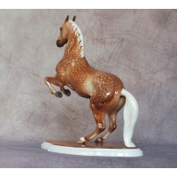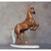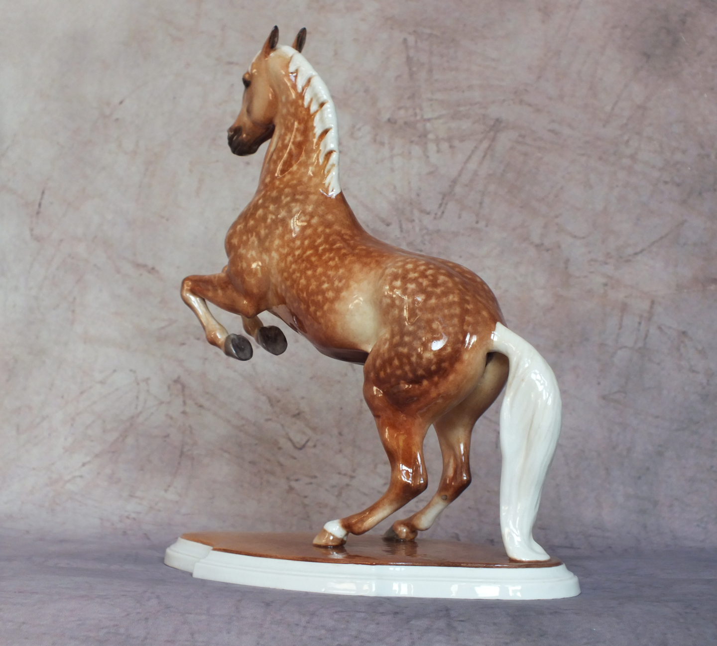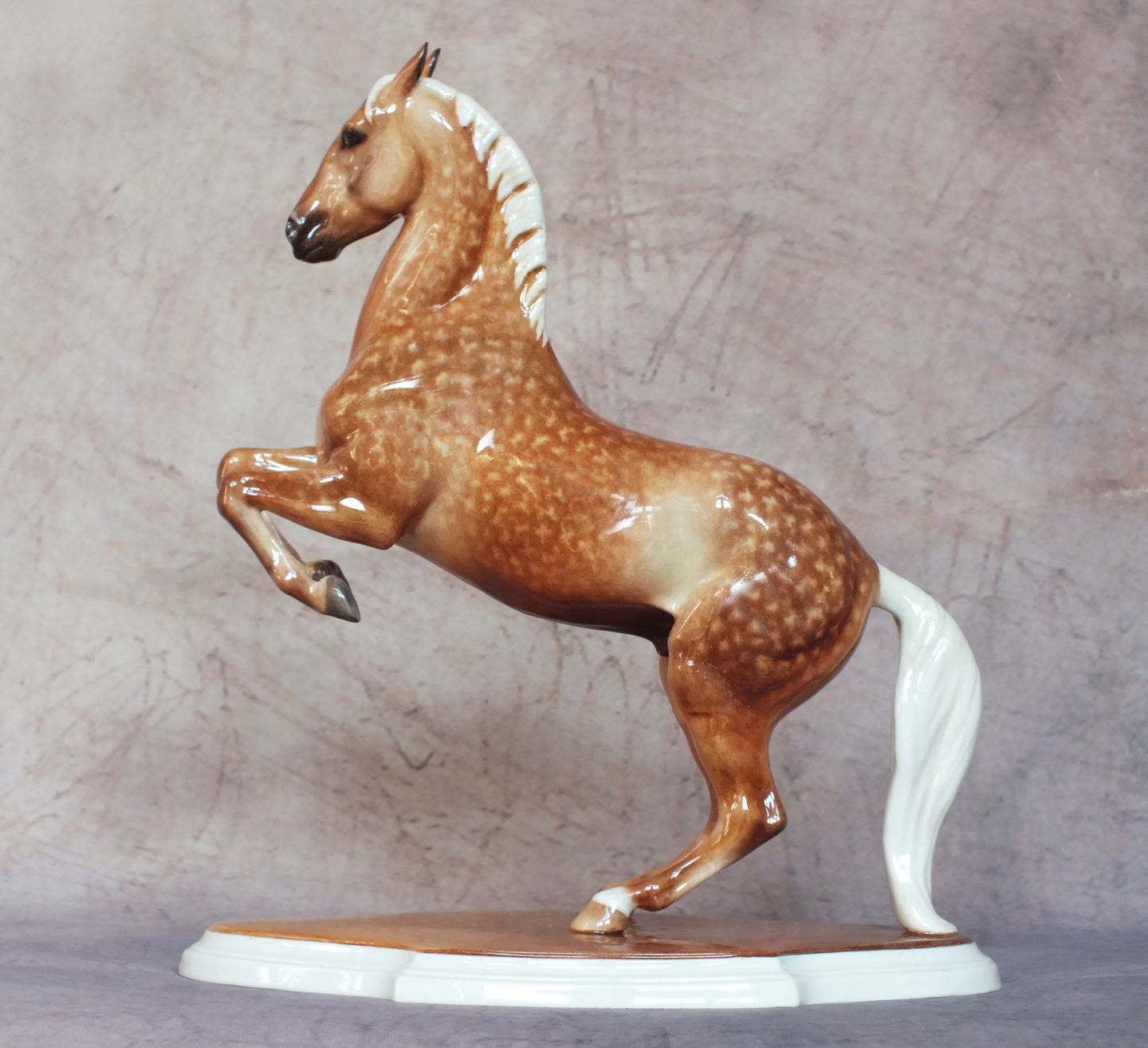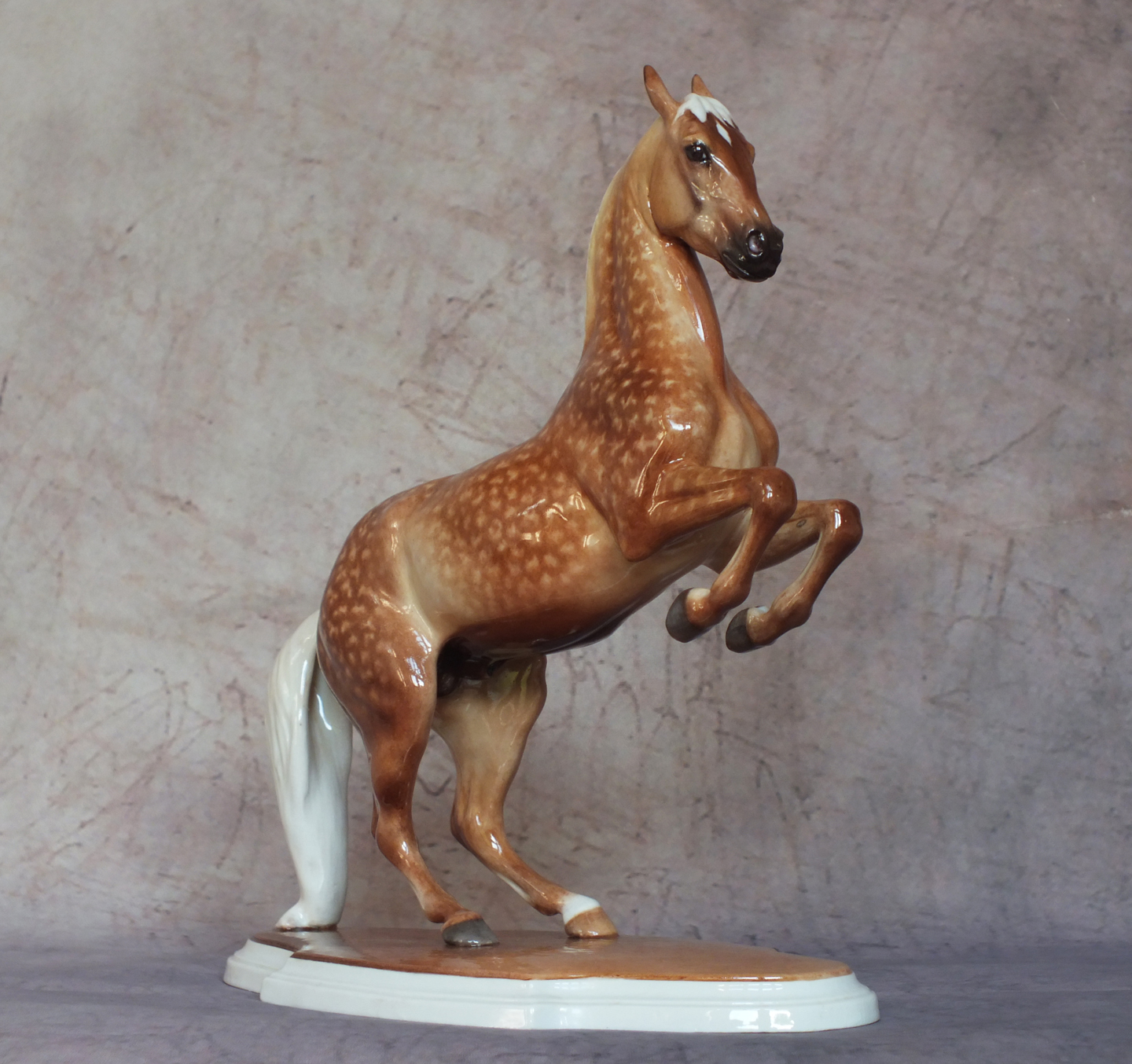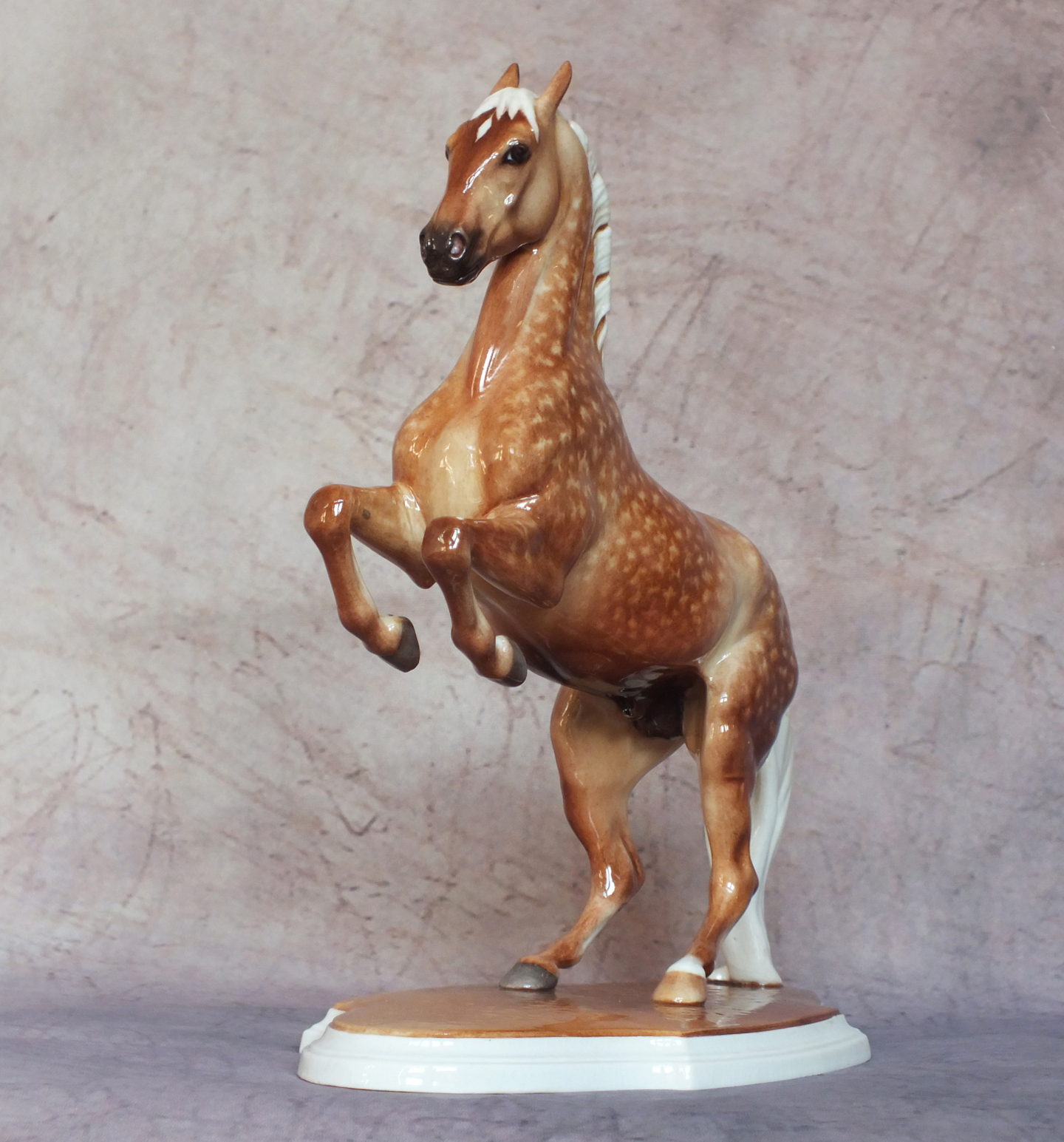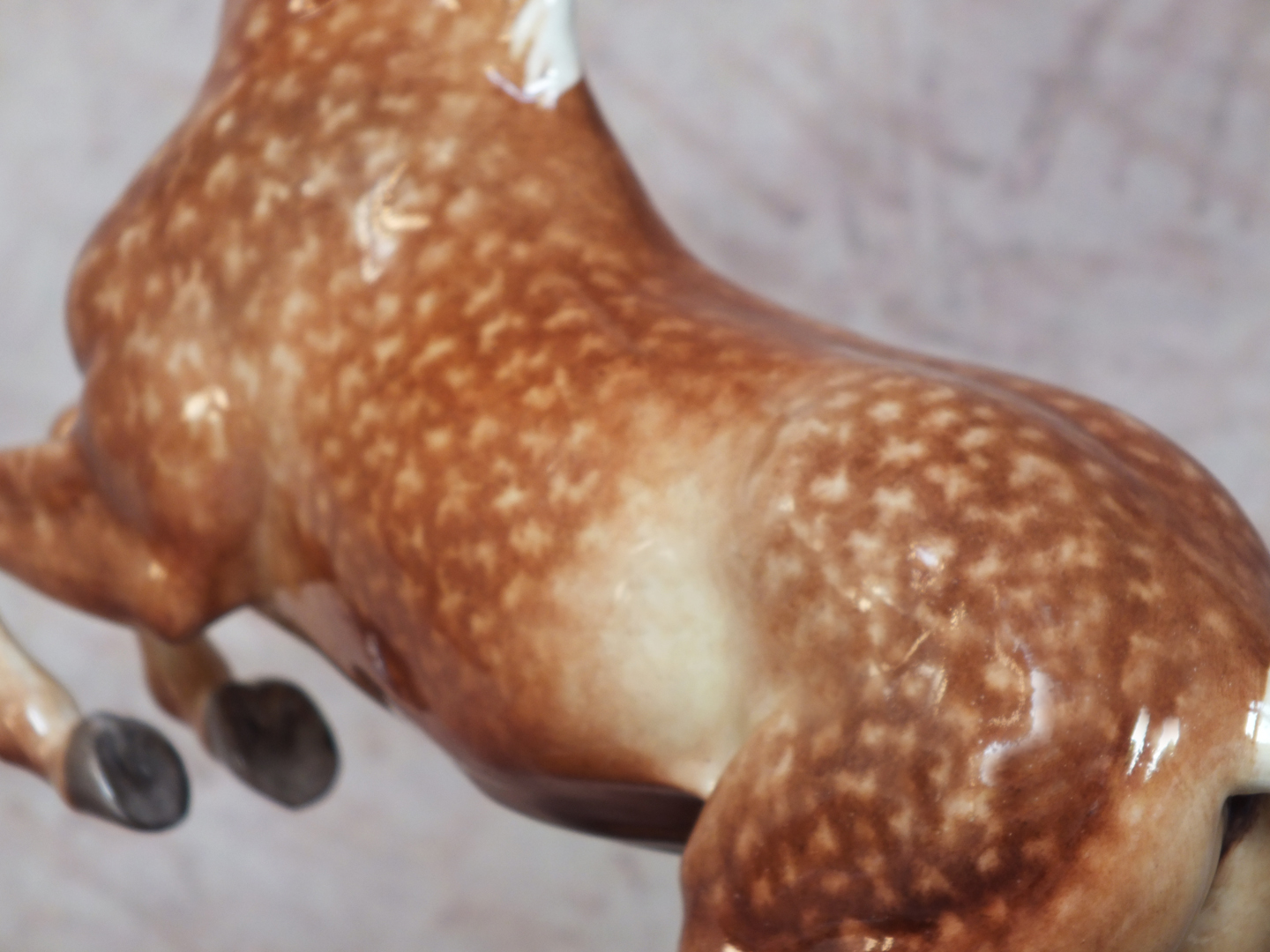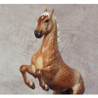 Lipizzaner, sculpted by Pamela Du Boulay and produced in porcelain by Franklin Mint as part of the Spanish Riding School of Vienna Collection (Levade). This is the large version which measures 8.75 inches in height. This one has been custom glazed by us, Horsing Around / The Horse Gallery to a stunning dark golden dapple palomino. The detail on this guy is fabulous. A small star and one hind white sock finish him off perfectly. He has been finished to a high gloss glaze which brings his colouring to life. Something very different and eye catching for your collection. Please note: There is a slight rough texture to the glaze in parts – this is difficult to see and does not deflect from this piece.