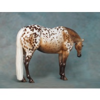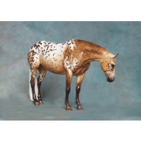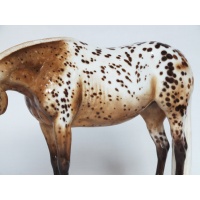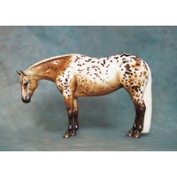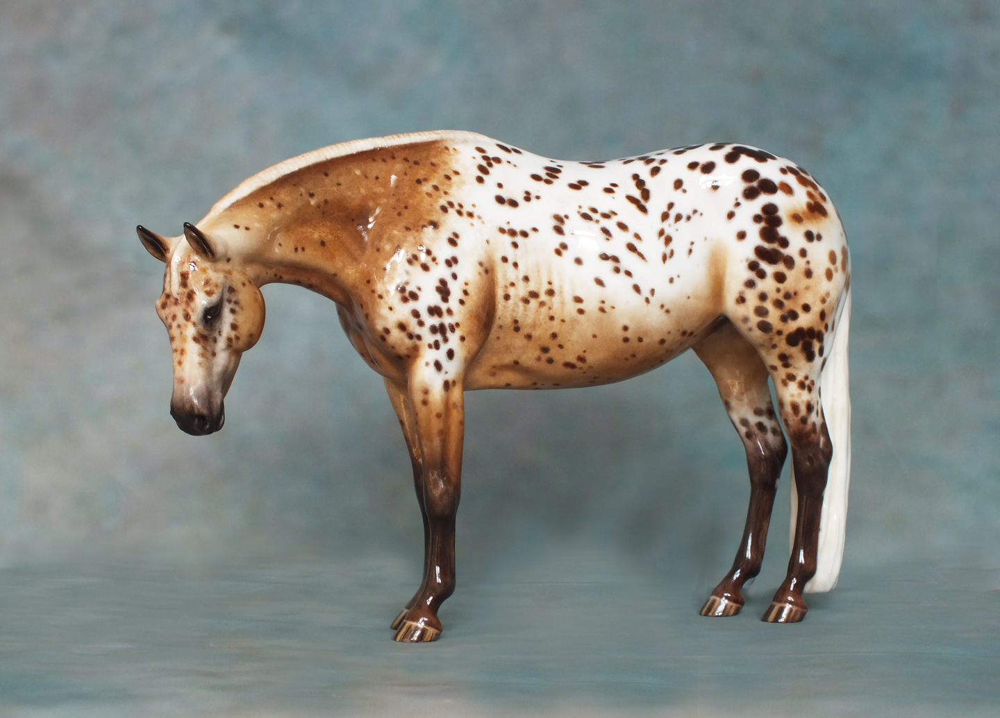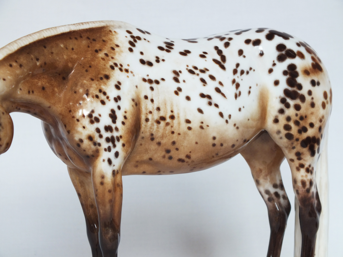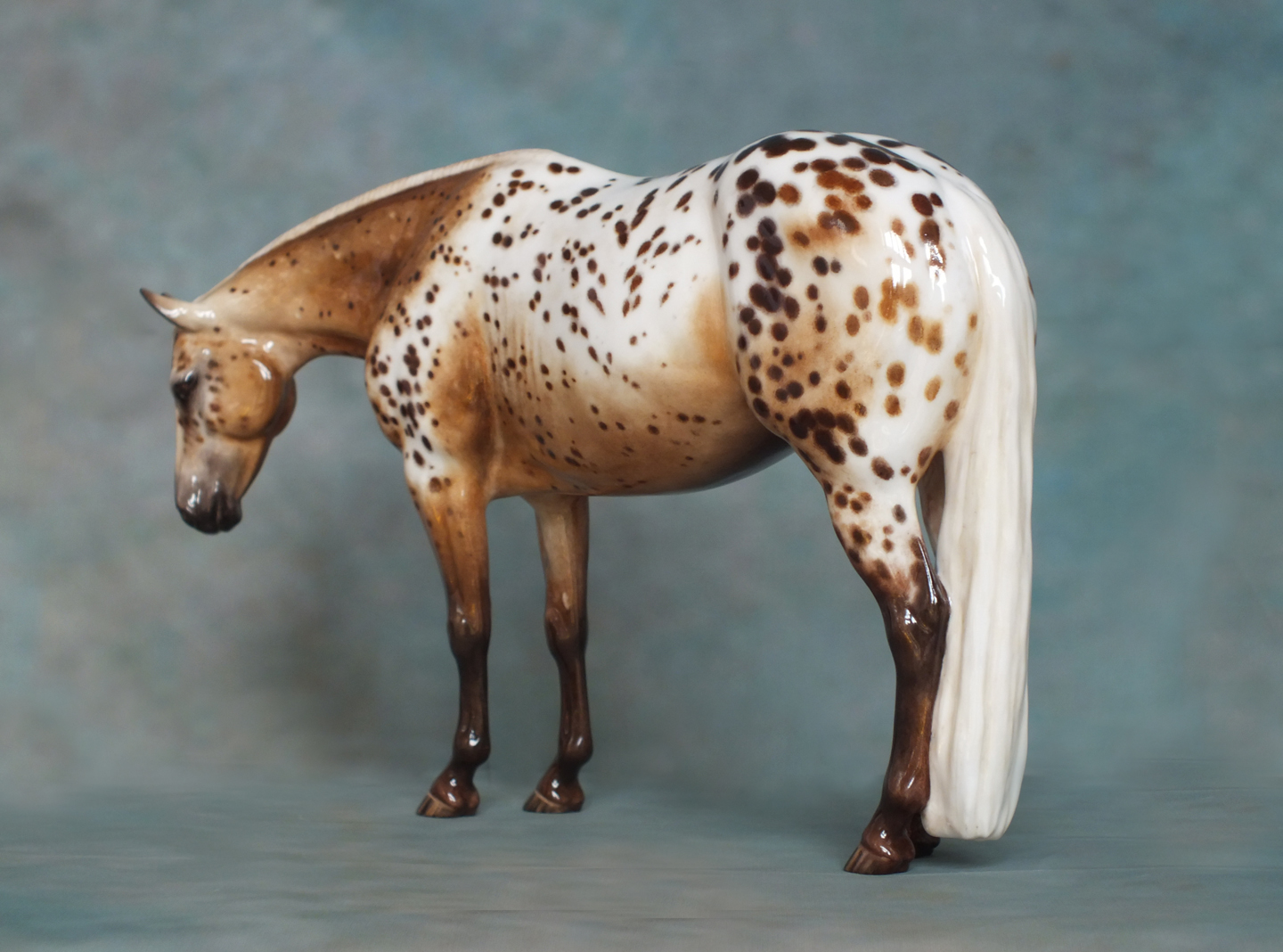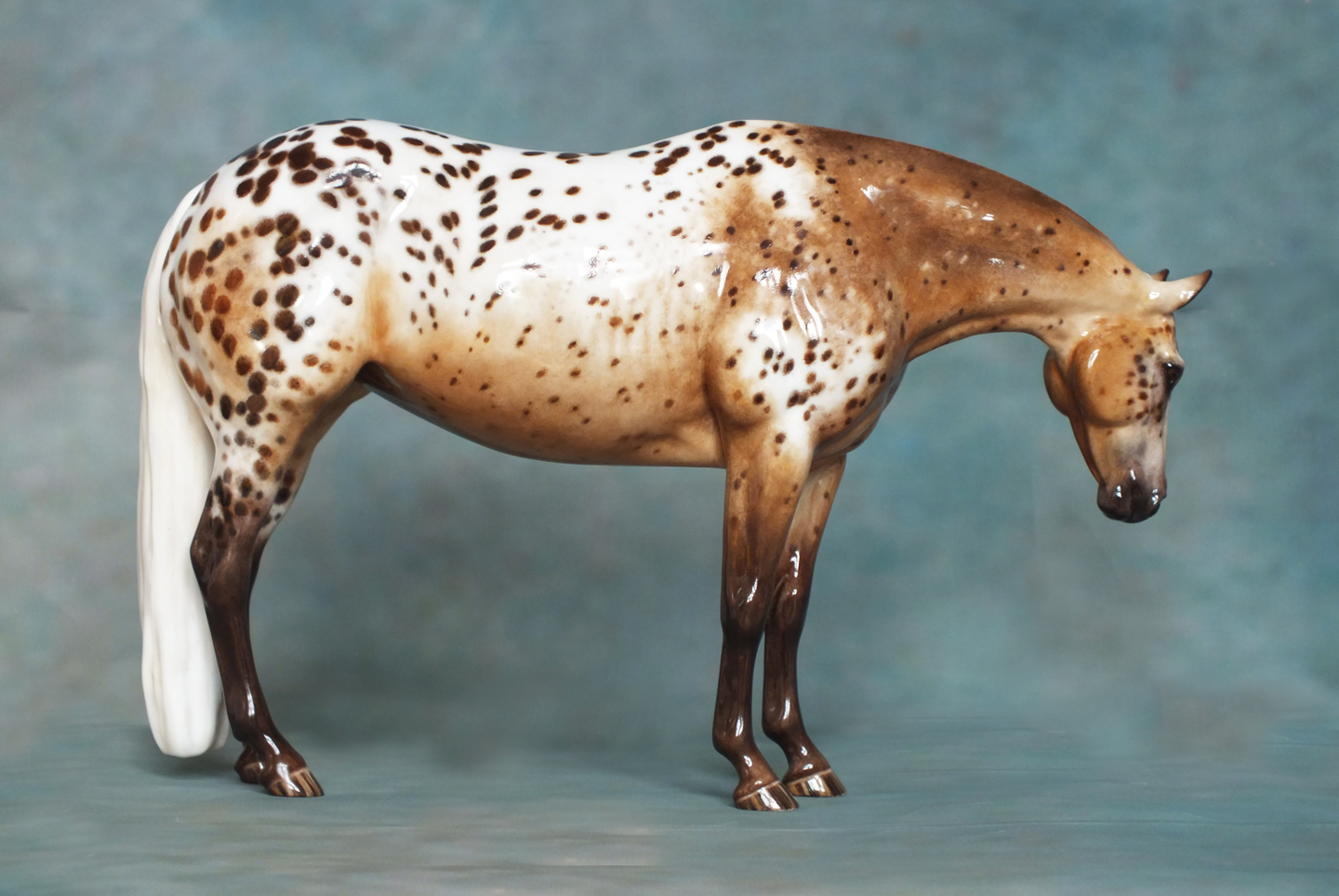 Lola, Stock Horse mare sculpted by Josine Vingerling and produced in fine bone china by Horsing Around / The Horse Gallery. This is a sold out edition. She is 6 inches in height. This one has been custom glazed to a stunning blanket appaloosa. She has so much detail – halos to her spots, dark spotting, detailed striped hooves, roaning to her tummy and much more. She is finished off in a gloss glaze which brings her colouring to life perfectly.